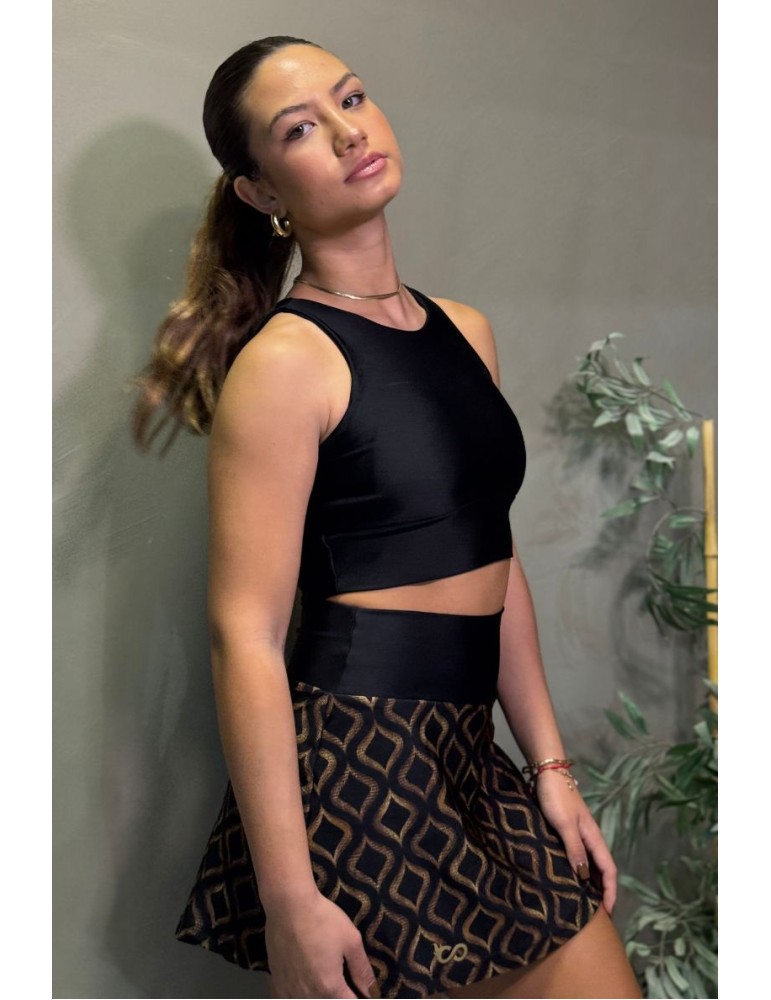 Essa saia  uma peça versátil tanto para prática esportiva, quanto para os momentos de lazer. Confeccionada em tecido trilobal, com toque macio e leve brilho, possui cós mais altinho e modelagem levemente evasê, que valorizam o corpo. Short interno de média compressão.